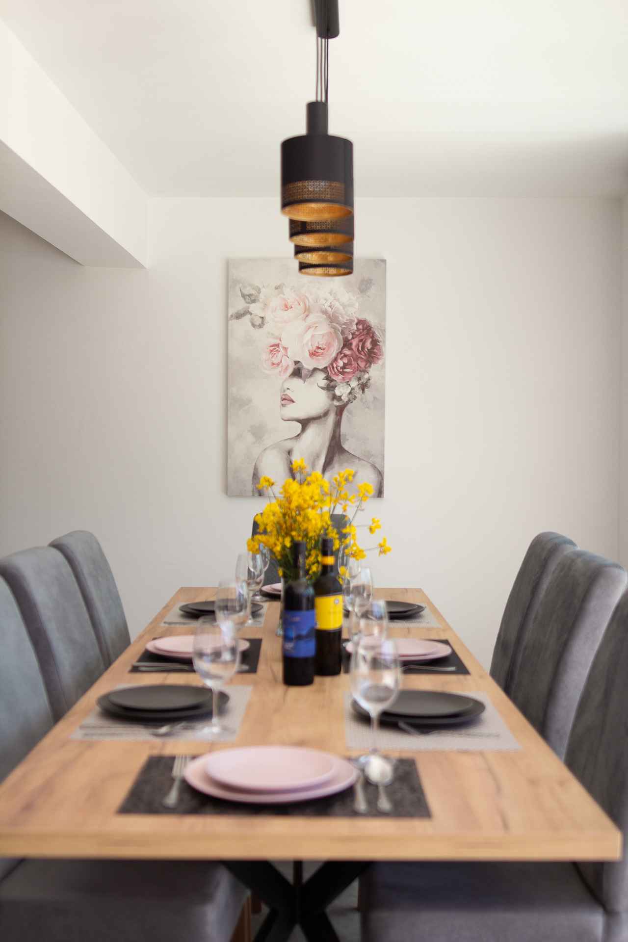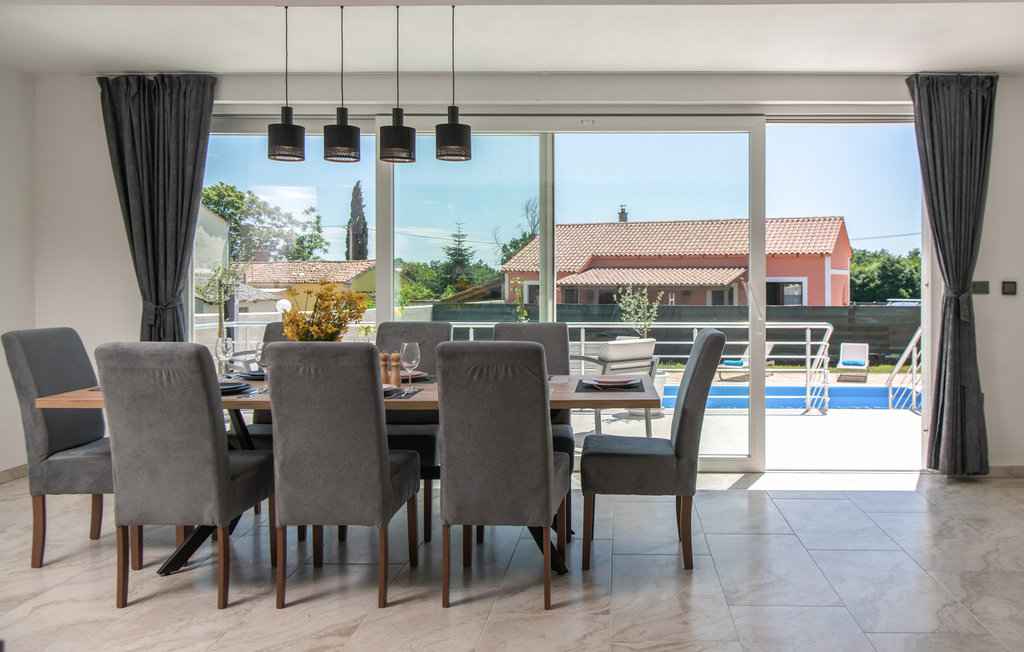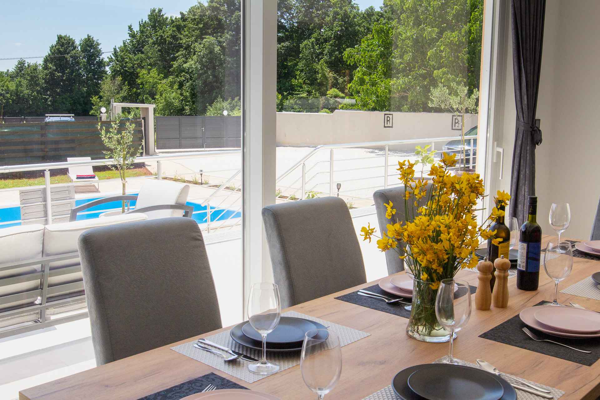 The dining room is elegantly decorated and offers enough space for all guests, creating an ideal place for shared meals. The dining room offers a beautiful view of the spacious terrace that leads to the 40m2 swimming pool . This spacious terrace is equipped with beautiful garden furniture and is ideal for relaxing in the sun, while in the evening you can let loose with a glass of Istrian wine and enjoy evening gatherings by the pool.