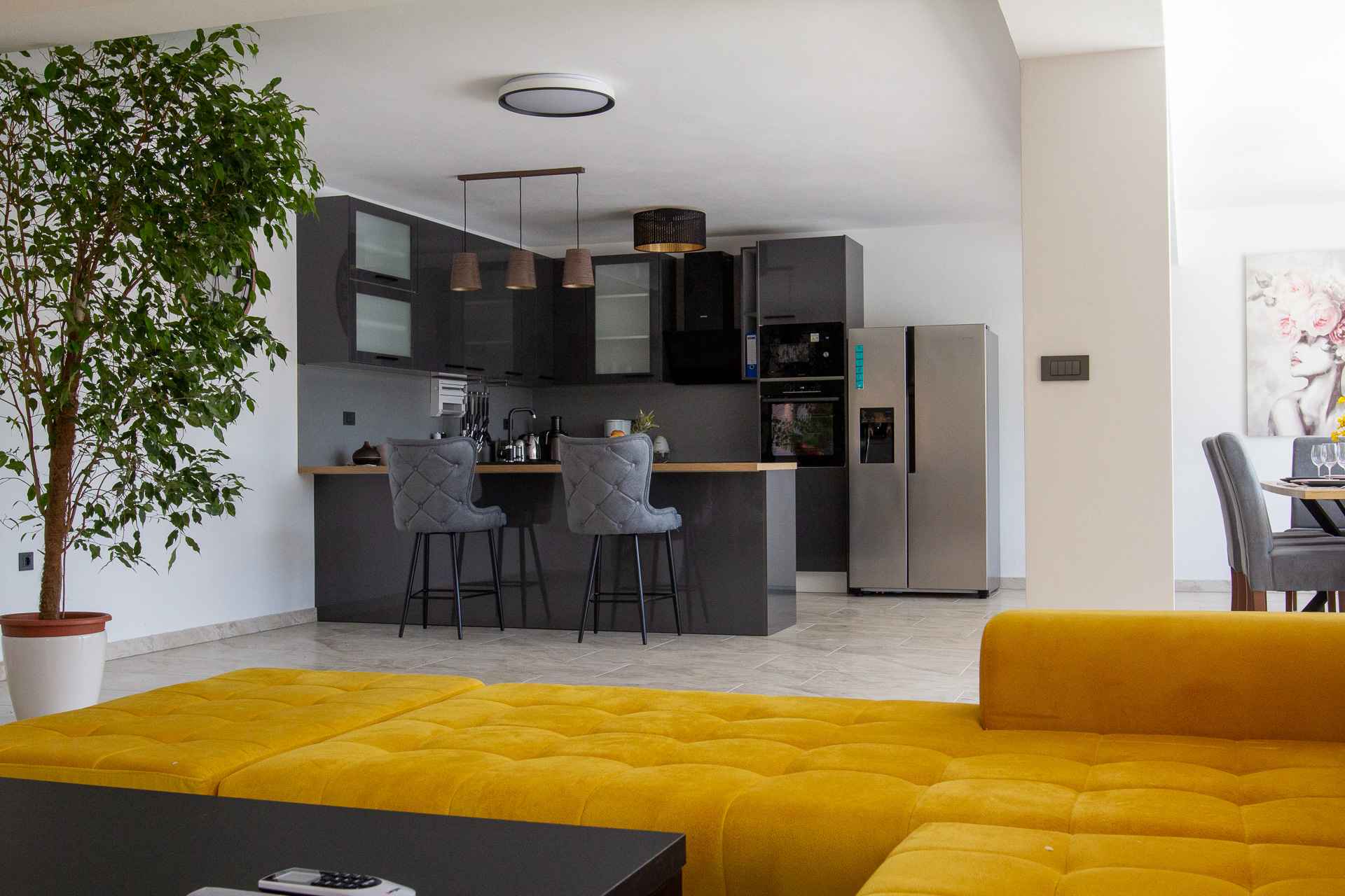 The large living room is the heart of the villa, decorated with a comfortable sofa and elegant decor, creating an ideal space for relaxation and socializing. The spacious living room is connected to the kitchen, fully equipped with modern appliances , providing the perfect environment for preparing delicious meals.